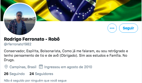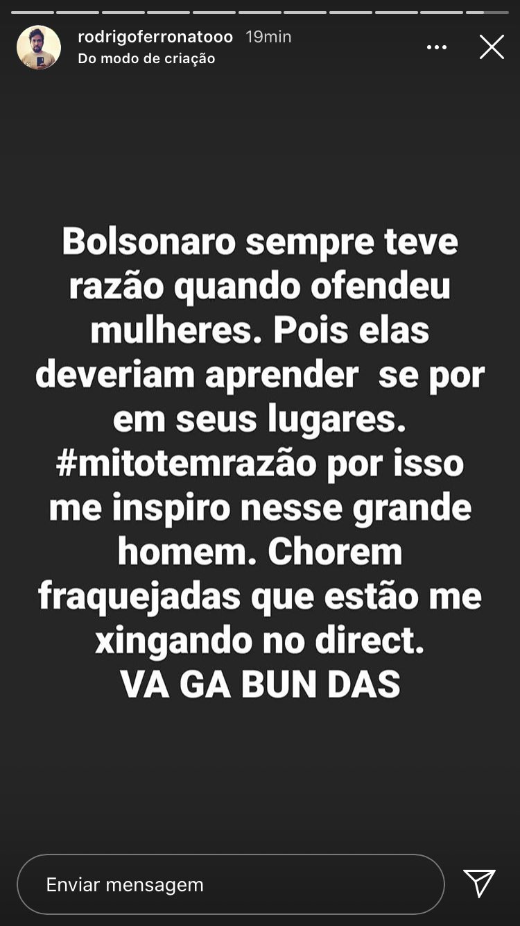 “Como já me falaram, eu sou retrógrado e tenho pensamento de tio e de avô (Obrigado). Sim aos estudos e Família. No Drugs”.