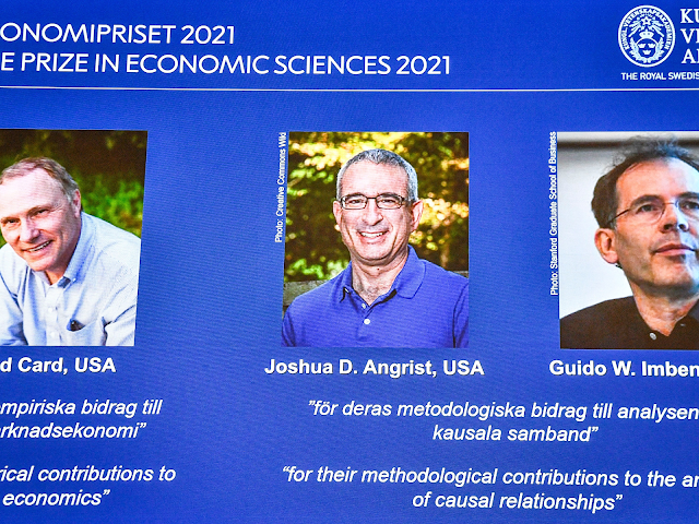 Angrist (Instituto de Tecnologia de Massachusetts) e Imbens (Stanford), que juntos receberam a outra metade do título, ganharam o prêmio por suas contribuições para a análise das relações causais.