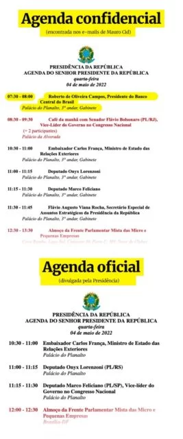 A informação, que aparece em um e-mail com título “Agenda Confidencial do PR: 04/5/2022”, foi enviada para o tenente-coronel Mauro Cid, então ajudante de ordens da Presidência, às 20h56 do dia anterior ao encontro.